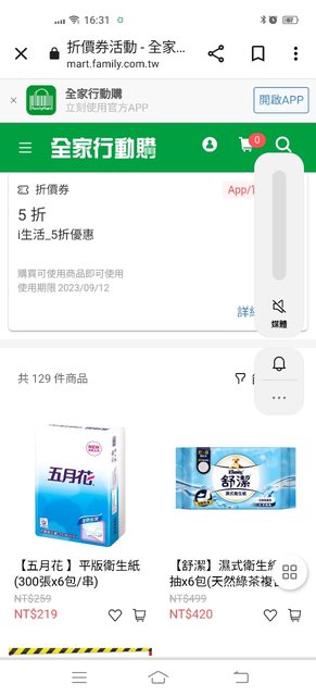 剛剛在找有沒有便宜的洗衣精 原本已經在生活市集買到4大瓶319 結果點了全家行動購看了一下 發現今天有5折券 https://i.imgur.com/dK82IrZ.jpg