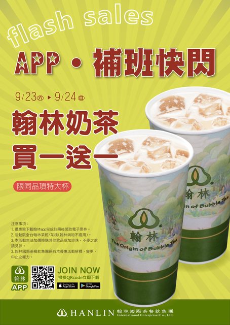 翰林奶茶特大杯買一送一 9/23~9/24 限時兩天特價 -- ※ 發信站: 批踢踢實業坊(web-ptt.tw), 來自: 36.229.137.216 (臺灣) ※ 文章網址: https://web-ptt.tw/Lifeismoney/M.1695440853.A.EAD