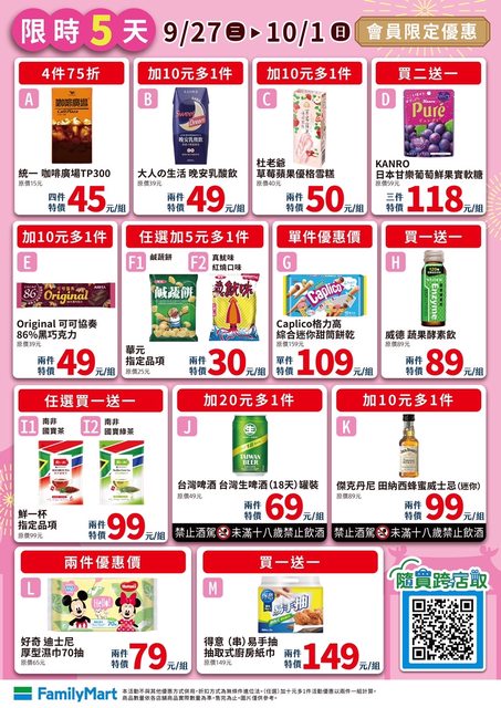 【活動名稱】:會員限時優惠 【便利商店/廠商名稱】:全家 【活動時間】:2023/09/27~2023/10/01 【活動內容】: https://i.imgur.com/deTNGHI.jpg
