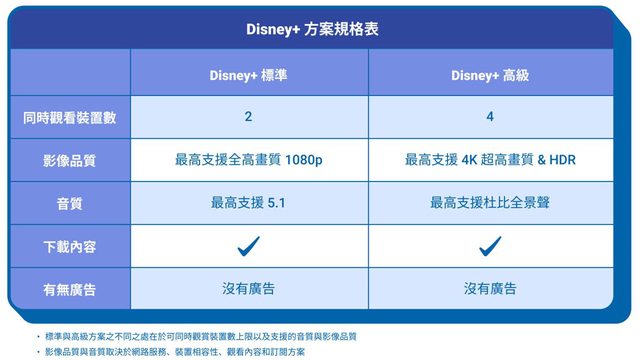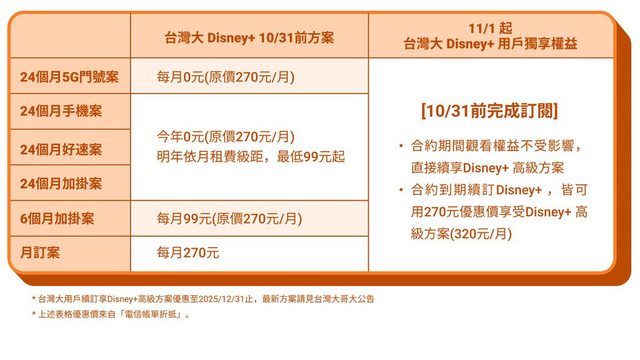 Disney+新方案及價格將上線!台灣大推強勢回饋方案 2023/09/27 15:40:20 聯合報 記者陳立儀/即時報導 Disney+將於11月1日起推出全新方案與價格,原Disney+方案將更名為「Disney+高級方案 」(價格調整為每月320元),並同步推出全新「Disney+標準方案」(價格為每月270元 )。台灣大哥大強勢補貼用戶,10月31日前於台灣大哥大或台灣大寬頻訂閱Disney+的用 戶,自11月1日起仍可以優惠價每月270元續享「Disney+高級方案」,合約到期後續訂, 優惠價也不中斷,其中以「5G Disney+門號案」24個月最優惠,現省7,680元,還可獲得 最高27,600元的momo幣回饋。台灣大哥大再加碼快閃優惠,即日起至10月10日到台灣大Di sney+活動網頁,憑優惠序號「TWMSP」,申辦「Disney+單購月訂案」,即可現省65%月租 費,以270元連續觀看3個月Disney+。 台灣大哥大以優質5G網路服務,提供用戶高品質影音串流服務,並享電信帳單折抵優惠, 即日起至10月31日續約或新申辦「5G Disney+門號案」,即可享台灣大哥大請你看Disney + 24個月,約期現省7,680元,還可獲得最高27,600元的momo幣回饋,合約到期後續訂, 優惠價也不中斷。非新申辦或續約的用戶另有「Disney+加掛方案」可選擇,連續6個月, 可以優惠價每月99元(原價每月320元)續享「Disney+高級方案」。即日起至10月31日於 台灣大myfone門市、網路門市、台灣大哥大客服App和客服188等多元通路皆可申辦。 台灣大哥大加碼推出Disney+快閃優惠,即日起至10月10日至台灣大哥大Disney+活動網頁 ,憑優惠序號「TWMSP」,申辦台灣大哥大「Disney+單購月訂案」,即可以優惠價270元 連續觀看3個月Disney+(自11月1日起續享Disney+高級方案),平均每月只要90元,省下 超過65%月租費。 「Disney+標準方案」費用為每月270元,支援2台裝置同時觀看、最高支援全高畫質1080p 和5.1音質;「Disney+高級方案」費用每月320元,提供更卓越的觀影體驗,包含最多4台 裝置同時觀看、最高支援4K超高畫質&HDR、最高支援杜比全景聲。兩種方案皆可於多達10 個裝置下載影音內容,並建立最多7個不同使用者,享有個人化推薦。 https://i.imgur.com/zekCfjn.jpg