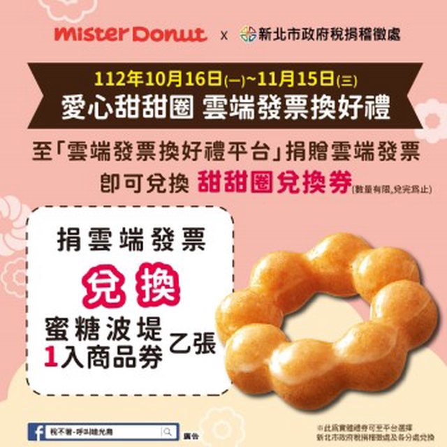 10/16~11/15 至「雲端發票換好禮平台」捐贈雲端發票 可兌換Mister Donut 蜜糖波堤兌換券1張 甜甜圈兌換券為實體禮券 可至平台選擇新北市政府稅捐稽徵處及各分處兌換 https://i.imgur.com/d8ZnuNn.jpg