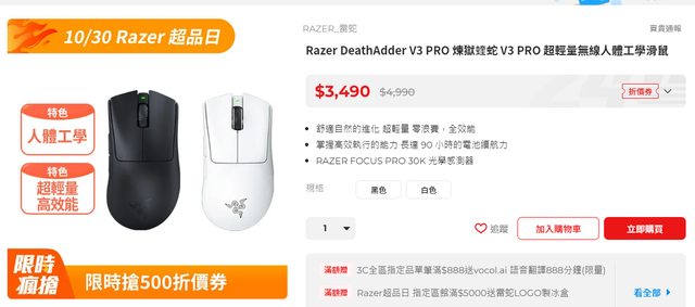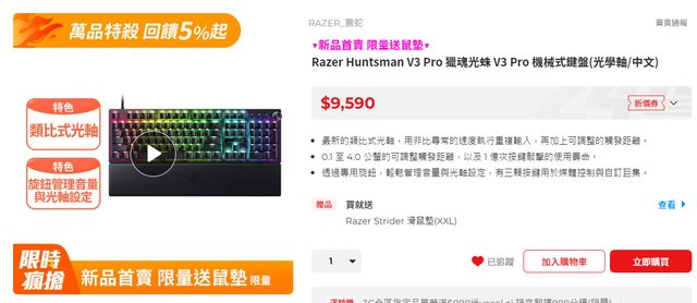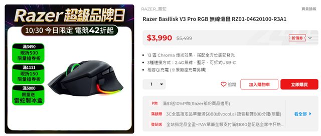 這款關注一陣子了,pchome這波Razer超品日首賣價$9590 用6111-511的券+指定滿額送511+288+120 P幣 (PS滿額登記送只有120P幣那個有限量要搶登記) 這樣折下來這台才8160,蠻少看到新品有折到這樣的,應該是目前各平台通路最低價 PC超品日的網頁: https://reurl.cc/5OV95v 這檔滑鼠折後蠻多新低價,V2 PRO、V3、V3 PRO在蹲的可以參考 https://i.imgur.com/mMy9CjQ.png