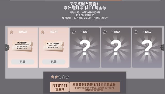 領券活動26號就開始了到11/5連續簽到五天可以領1111現金券 https://i.imgur.com/G0tzL2t.png