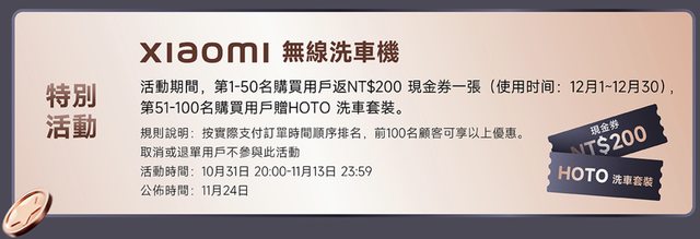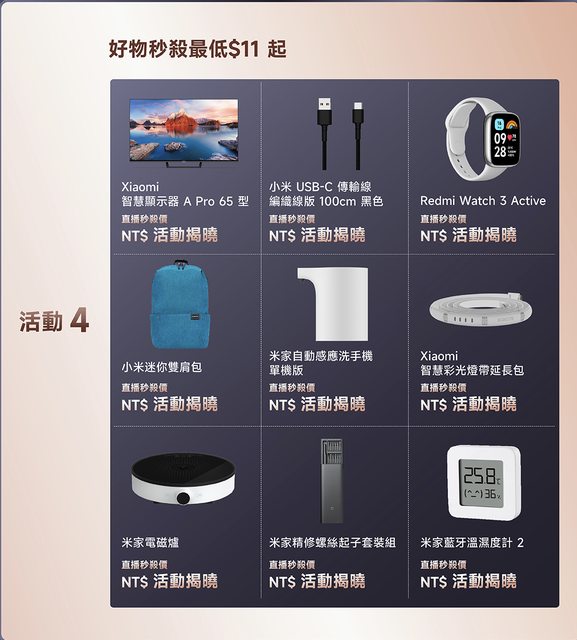 直播網址:https://www.mi.com/tw/live/2023double11 直播時間:20:00開始 直播開始熱場券:111現金券(滿1111使用,直播當日可用) 觀看直播用戶優惠券:93折券(滿5000使用,手機pad新品不能用)、500手機券(限購手機滿99 99可用),以上兩張都是直播當日可用,時效20:00-23:59 直播當日限定活動: 20:00-20:59 滿額贈禮:訂單滿11,111送Redmi Buds 4 Active 曜石黑(限量111個) 加價購: 任意商品(加895 買小米智慧攝影機 雲台版 2K Pro 或 小米多功能手電筒) 清掃類(買清掃家電,加1111 買Redmi Watch 3 Active) 穿戴類(買穿戴產品滿3件減100) 影音家電(買影音家電加2595買小米氣炸鍋6.5L 黑色,這是新品) 秒殺活動(直播當下才會揭曉價格) https://i.imgur.com/IED3LV4.png