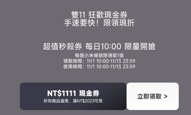 11/1早上10:00開始有限量的1111現金券(這個就要拼手速跟網路速度) https://i.imgur.com/oO9KKGz.png