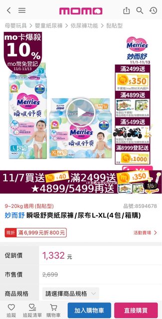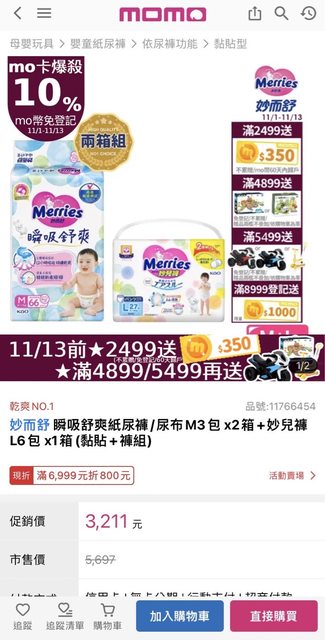 總共 3211 買這個組合可以直接拿350mo幣 刷mo卡免登記再回饋10%mo幣 跟酷澎比了一下,在酷澎上買一模一樣是2838 算上mo卡回饋+mo幣是mo便宜 Mo買多還有6999折800、送玩具、車子的滿額禮、8999有送1000都可以湊 瞬吸舒爽紙尿褲/尿布L-XL(4包/箱購) https://i.imgur.com/9oMvi7p.jpg