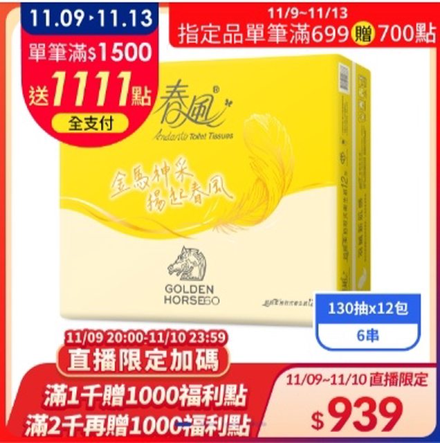 春風 抽取式衛生紙(130抽x12包x6串) 金馬版 $939
