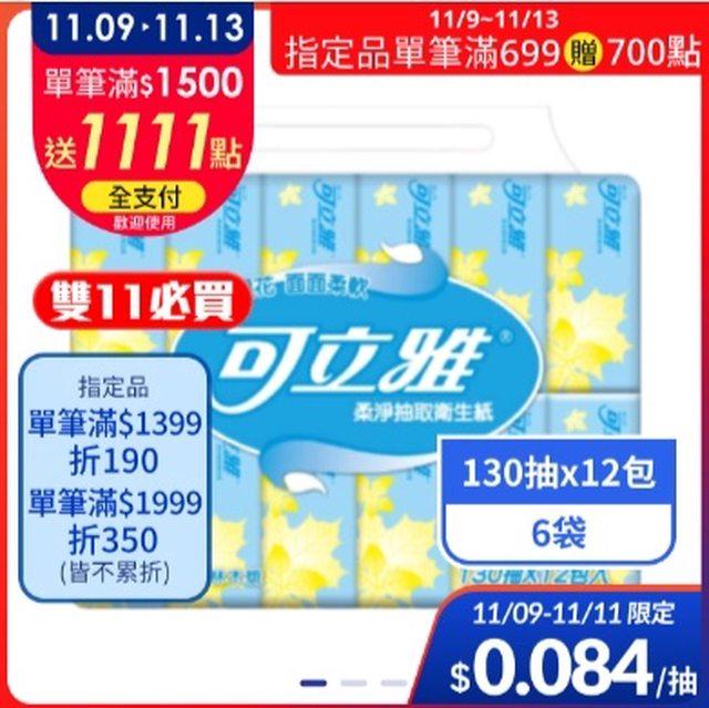 可立雅 柔淨抽取式衛生紙(130抽x12包x6袋) $779