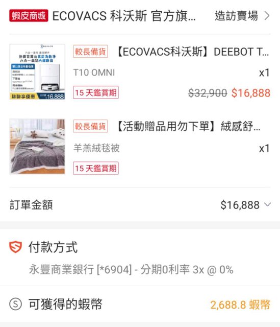 蝦皮科沃斯T10 omni 退蝦幣2,688 +送毯子 附上購買清單 http://i.imgur.com/9gHyxit.jpg