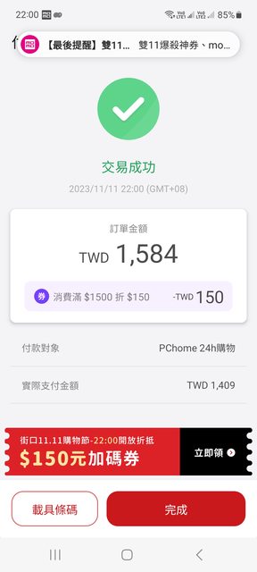 推 Vessel: 街口付款1350有成功 可是pchome一直說沒 101.136.108.89 11/11 22:05