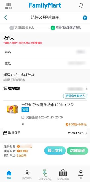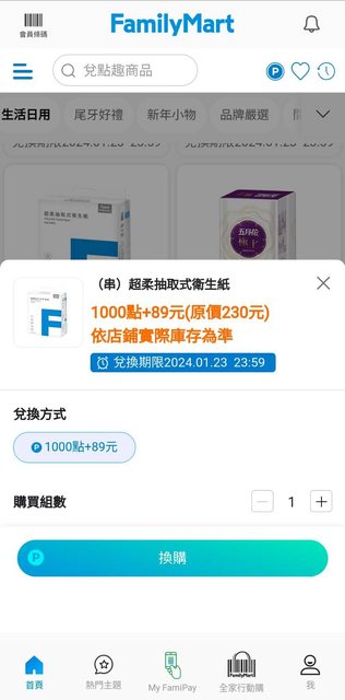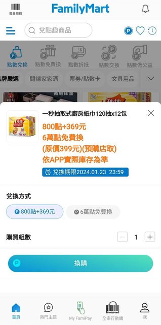現在只要在全家App裡面看到平常會用到的…我都直接在APP換了 哈 剛看有春風廚房紙巾 800點+369元蠻便宜的立馬買 (有6萬點數的可以免費換 換算才200元超划算) https://i.imgur.com/yyGqucS.jpg