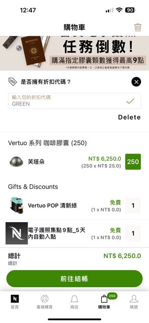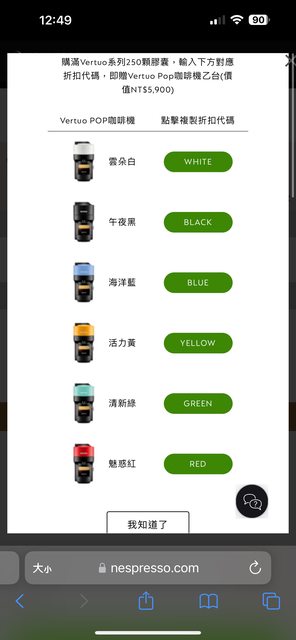 放250個VERTUO膠囊在購物車 輸入VERTUO POP機器顏色代碼 就能下單了 12月初寄一次快閃優惠簡訊給我 雙12又寄一次 說是限定優惠 昨天又寄一次 直接變到年底 滿優惠的 但已經沒在喝膠囊了 有Nespresso會員帳號的 可以去試看看有沒有在這波名單裡 -- ※ 發信站: 批踢踢實業坊(web-ptt.tw), 來自: 101.10.112.69 (臺灣) ※ 文章網址: https://web-ptt.tw/Lifeismoney/M.1703740979.A.928