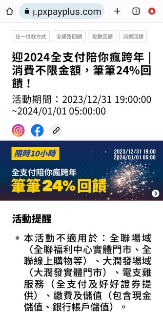 本活動不適用於:全聯場域(全聯福利中心實體門市、全聯線上購物等)、大潤發場域( 大潤發實體門市)、電支雞服務(全支付及好好證券提供)、繳費及儲值(包含現金儲值 、銀行帳戶儲值)。 活動期間(2023/12/31 19:00:00 ~2024/01/01 05:00:00,共10小時),於全支付合作夥 伴,使用全支付付款,單筆消費不限金額,筆筆24%全點(下同)回饋,每一全支付帳號回 饋上限88點,回饋之全點將以四捨五入計算至個位,本活動總回饋限量480,000點,以消 費優先順序計算,贈完為止。 我是打算去八方買個花枝丸回家冷凍,還有更好的建議嗎? -- ※ 發信站: 批踢踢實業坊(web-ptt.tw), 來自: 116.89.135.5 (臺灣) ※ 文章網址: https://web-ptt.tw/Lifeismoney/M.1704006349.A.CF2