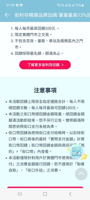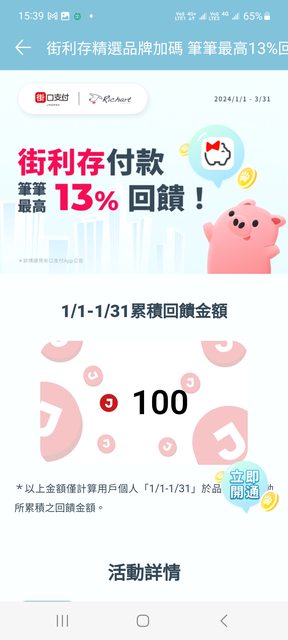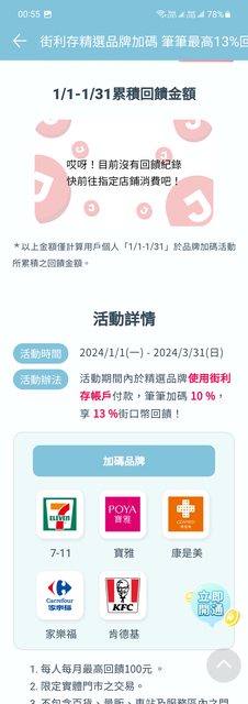 ※ 引述《medama ( )》之銘言: : https://www.facebook.com/JKOPAY : 【街利存品牌加碼|筆筆13%回饋】 : 活動期間: : 2024/1/1~2024/3/31 : 活動辦法: : 於精選品牌使用街利存帳戶付款,筆筆加碼 10 %,享 13 %街口幣回饋!(每人每月最高? : 饋100元) : 加碼品牌: : 7-11、寶雅、康是美、家樂福、肯德基 : *本活動回饋上限採全指定通路合計, 1/1家樂褔滿2千給10%券 http://i.imgur.com/1BwxQLY.jpg