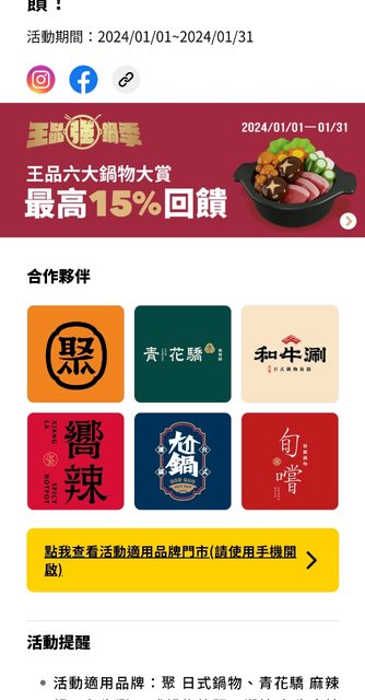 於活動指定適用品牌門市,使用全支付連結帳戶付款,消費不限金額,筆筆享全點(下同) 15%回饋 | 使用全支付綁定信用卡付款,消費不限金額,筆筆享全點10%回饋。 本活動所有於適用品牌門市消費之回饋點數將合併計算,每一全支付帳號單筆消費最高可 得150點,每一全支付帳號回饋上限300點;總回饋限量540,000點,以消費優先順序計算 ,贈完為止。 剛剛吃完還有 記得單筆上限150點 超過請分兩筆結帳 銀行帳戶才有15% 和牛涮598*1.1=659 搭配會員禮-50 659-50=609 回饋15% 609*0.85=約517左右 還算可以 -- ※ 發信站: 批踢踢實業坊(web-ptt.tw), 來自: 1.200.139.205 (臺灣) ※ 文章網址: https://web-ptt.tw/Lifeismoney/M.1706364599.A.684