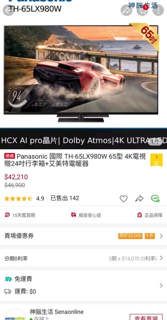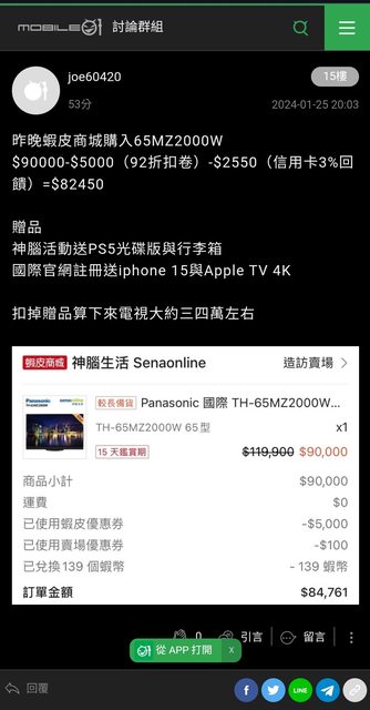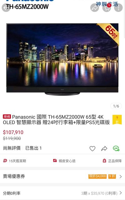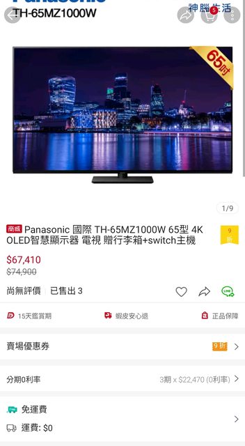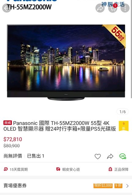 在蝦皮combo完優惠後扣掉贈品 65MZ2000 大概3萬多 但太晚發現已經被掃空來不及上車 東西也下架了 這幾天常常上去看 剛剛上去看上架了 一樣贈品有PS5或是switch https://i.imgur.com/D1OUKhl.jpg