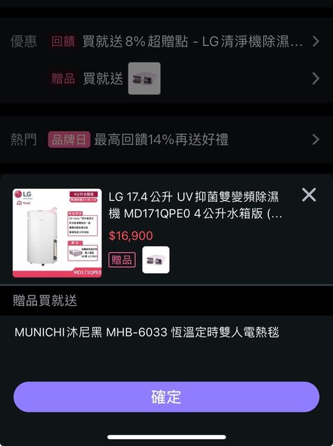 今天部分指定品最多有送到14%超贈點且無上限 如果是高單價的就有不少價差 清淨除濕和吸塵器比較多都是送8% 本來就有在觀望的商品可以去比價看看 https://reurl.cc/qrXY8R 有些商品領券可以再多折1千 領券連結:https://reurl.cc/2z3Qbm 我看的這台17.4公升變頻除濕機16900元 https://i.imgur.com/oeQl66s.jpeg