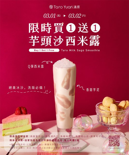 時間 : 3/1(五)~3/2(六) 地點 : 清原高屏地區門市 優惠 : 芋頭沙西米露買1送1 理由 : 為感謝大家長久以來的喜愛與支持,特別準備的驚喜活動 https://i.imgur.com/SYz98kF.png