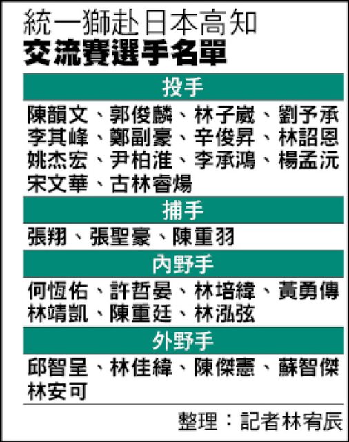 統一獅赴日本高知交流賽名單