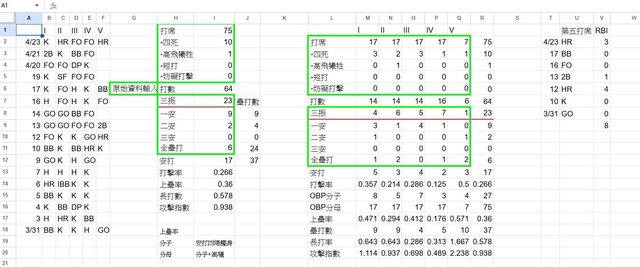 三圍0.5/0.571/1.667 OPS2.238 8分打點(在T~V欄)