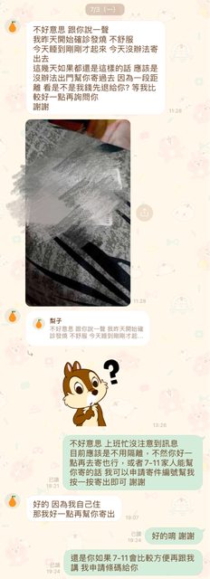→ CrystalSugar: 體仍不舒服 所以沒主動聯繫)即 有告知週一寄出 週 07/12 21:12