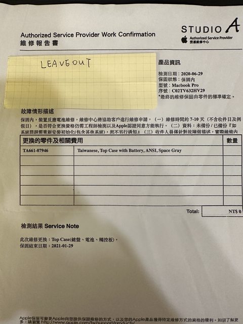 2020/06透過Apple Care更換完top case(鍵盤、電池、觸控板)