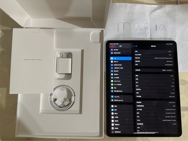 iPad Pro本體、原廠充電器、原廠充電線、原廠紙盒。