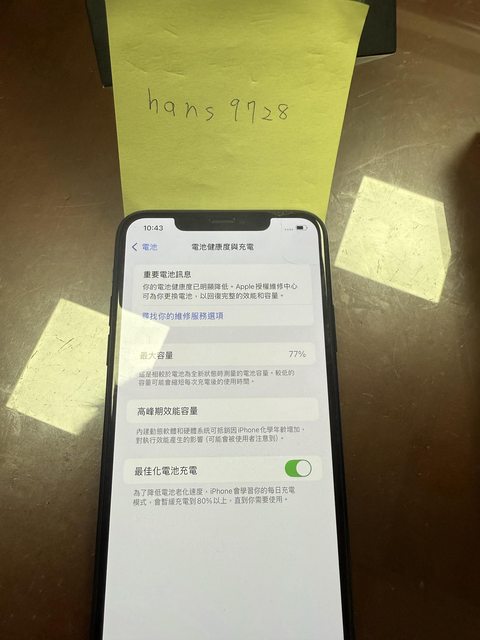功能正常,全機全原廠電池健康77%,螢幕保護貼有裂,但螢幕外觀皆無受損,有貼鏡頭貼