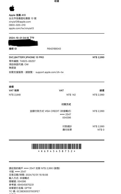 電力100% 10/1 A13 apple 原廠更換 2990新台幣