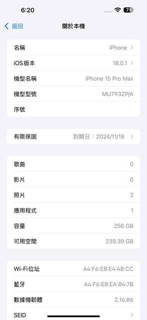 保固中,iOS 18.0.1,升級16 Pro max故售出,盒機序號一致,全機功能正常,電池健康