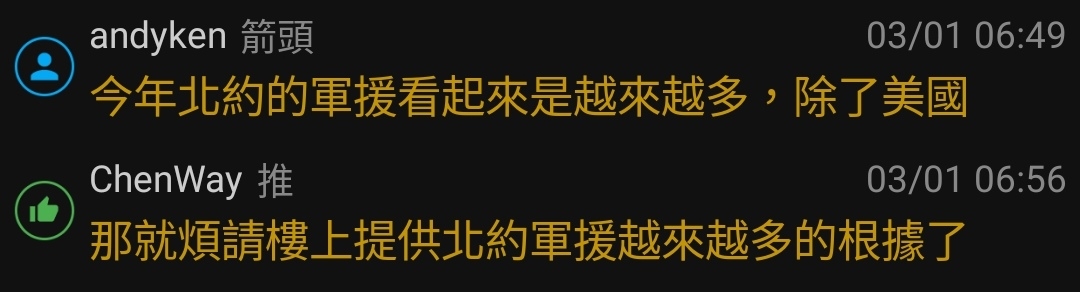 → LI40 : 更好笑的是其他人都覺得是在框架內討論北約軍援 有 03/02 02:41