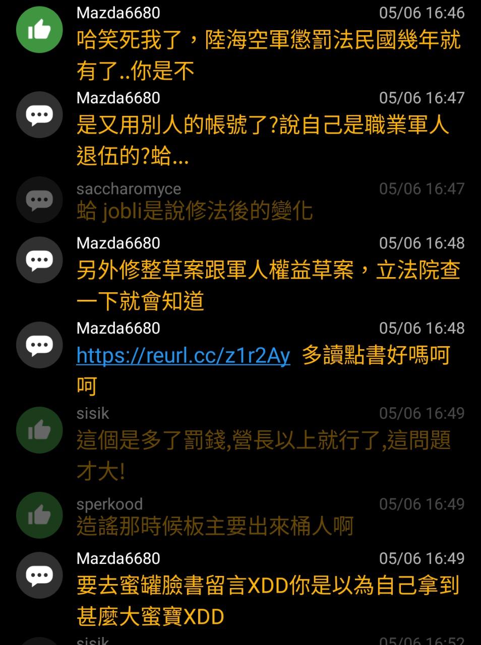 → Mazda6680 : 是又用別人的帳號了?說自己是職業軍人退伍的?蛤... 05/06 16:47