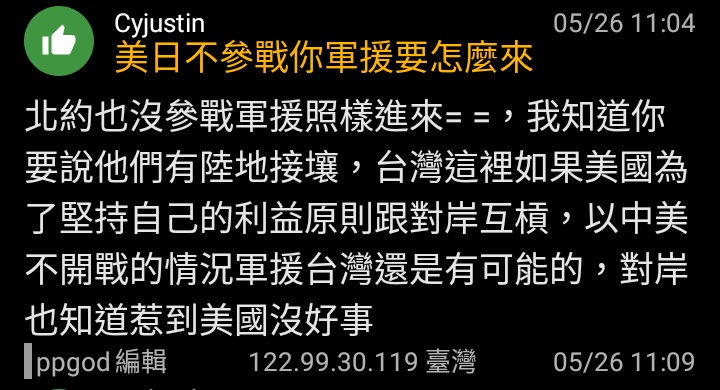 ppgod : 就是假設美日都不出兵只負責軍援台灣,而台灣的海05/26 10:10