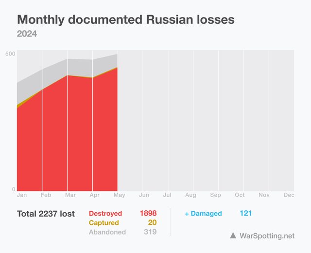WarSpotting 2024年 5月 俄羅斯裝備損失數量統計