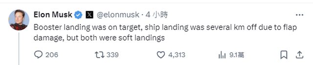 馬斯克本人在X特上留言稱SH助推器的降落位置符合原定目標,只是星艦S29本體因翼面受損而誤差了幾公里的距離