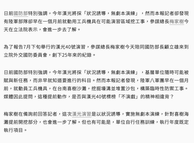 “漢光號稱沒劇本 陸軍仍提前挖海灘?”報導標題