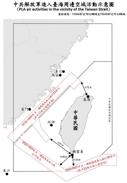 顯示,侵擾北部空域的共機,距離基隆約72浬;侵擾西南及東南空域的共機,分別距離鵝