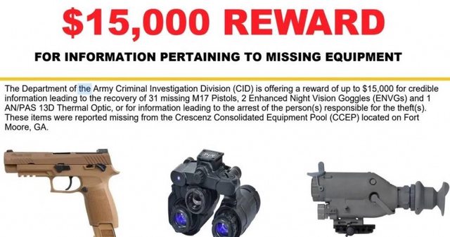 件光學設備莫名失竊,至今尚未尋回。為此,陸軍刑事調查部門(CID)日前將懸賞金額
