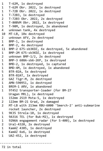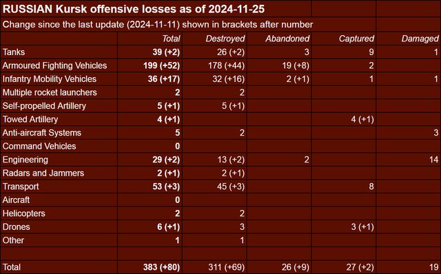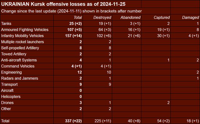 目視確認損失軍事裝備統計 2024.11.23 ~ 11.26
