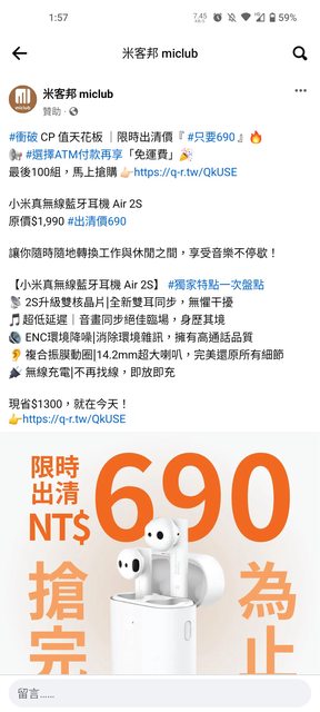 → NX9999 : 這個價不如買自家的Redmi buds 4也划算 09/25 14:08