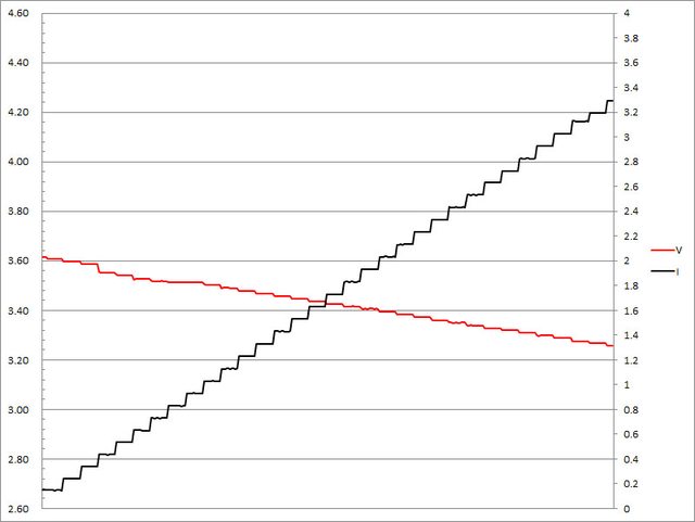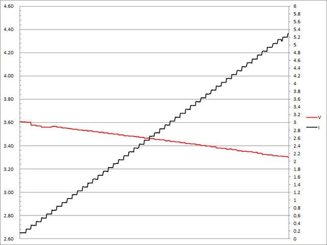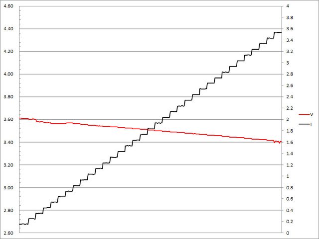 ▼搭配5A線材的第一組小米閃充PPS檔3.6V輸出負載測試,隨著電流增加,輸出電壓下降