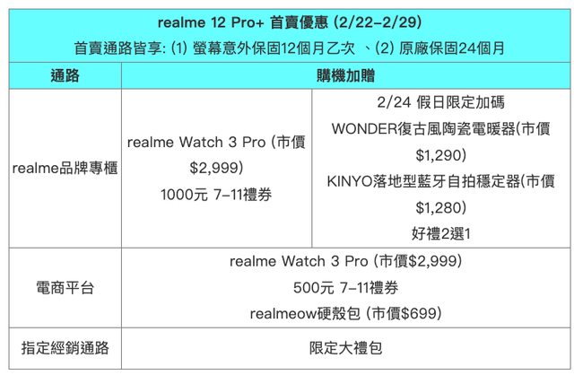 1.原文連結:https://www.eprice.com.tw/mobile/talk/6113/5807511/1/rv/realme-12-pr o-plus-launch/ 2.原文標題:realme 12 Pro+ 2/22 上市 建議售價 $18,990 首賣送二年保固 3.原文來源(媒體/作者):ePrice Jason 4.原文內容: realme 繼去年夏天的 realme 11 Pro 系列後,於今(21)日推出數字系列後繼款式 realm e 12 Pro+,它強調由國際精品名錶設計師操刀外觀設計、另外也是同價位帶首款搭載潛望 式望遠鏡頭的機種,並且搭配 12GB RAM 與 512GB 儲存空間,手機預計 2 月 22 日起在台 上市,單機建議售價 18,990 元,並將於 3 月 1 日起在三大電信門市上架。 https://i.imgur.com/V7D3oZQ.jpeg