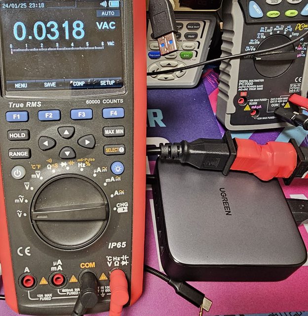 ◆插在正確接地的三孔插座上,Y電容分壓接地,USB-C及USB-A負極/連接器外殼不會帶電