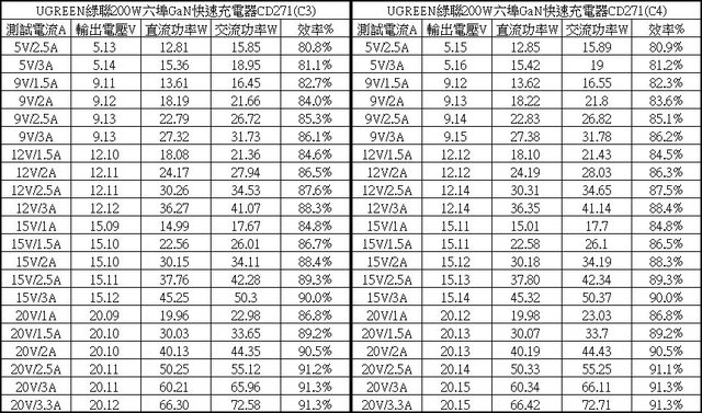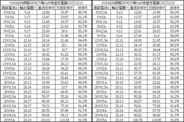 ▼C1/C2單獨使用下各組輸出轉換效率表,整體輸出轉換效率在80.2%至91.7%之間