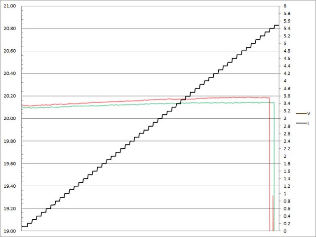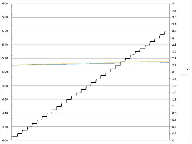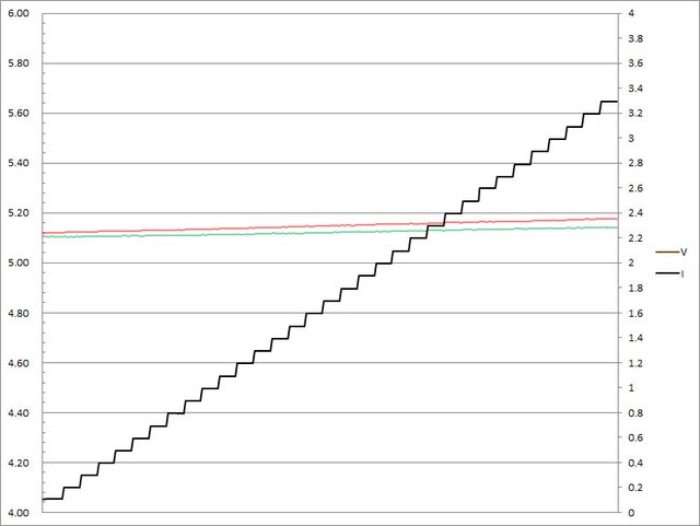 ▼C1(紅)/C2(綠)搭配5A線材的固定檔5V輸出負載測試,隨著電流增加,輸出電壓上升,