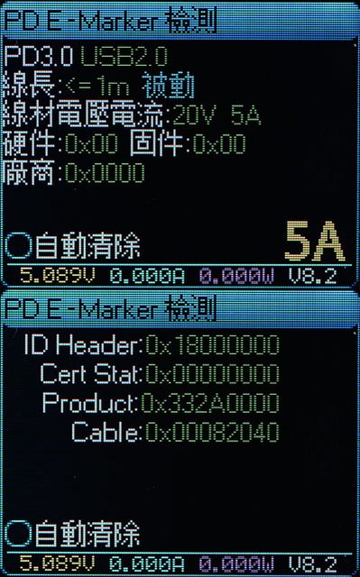 ▼充電線E-Marker資訊,電力傳輸支援20V/5A 100W,資料傳輸支援USB 2.0
