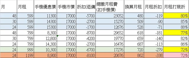 2.中低資費最划算是799(48個月)總折扣$8700,599(48月)