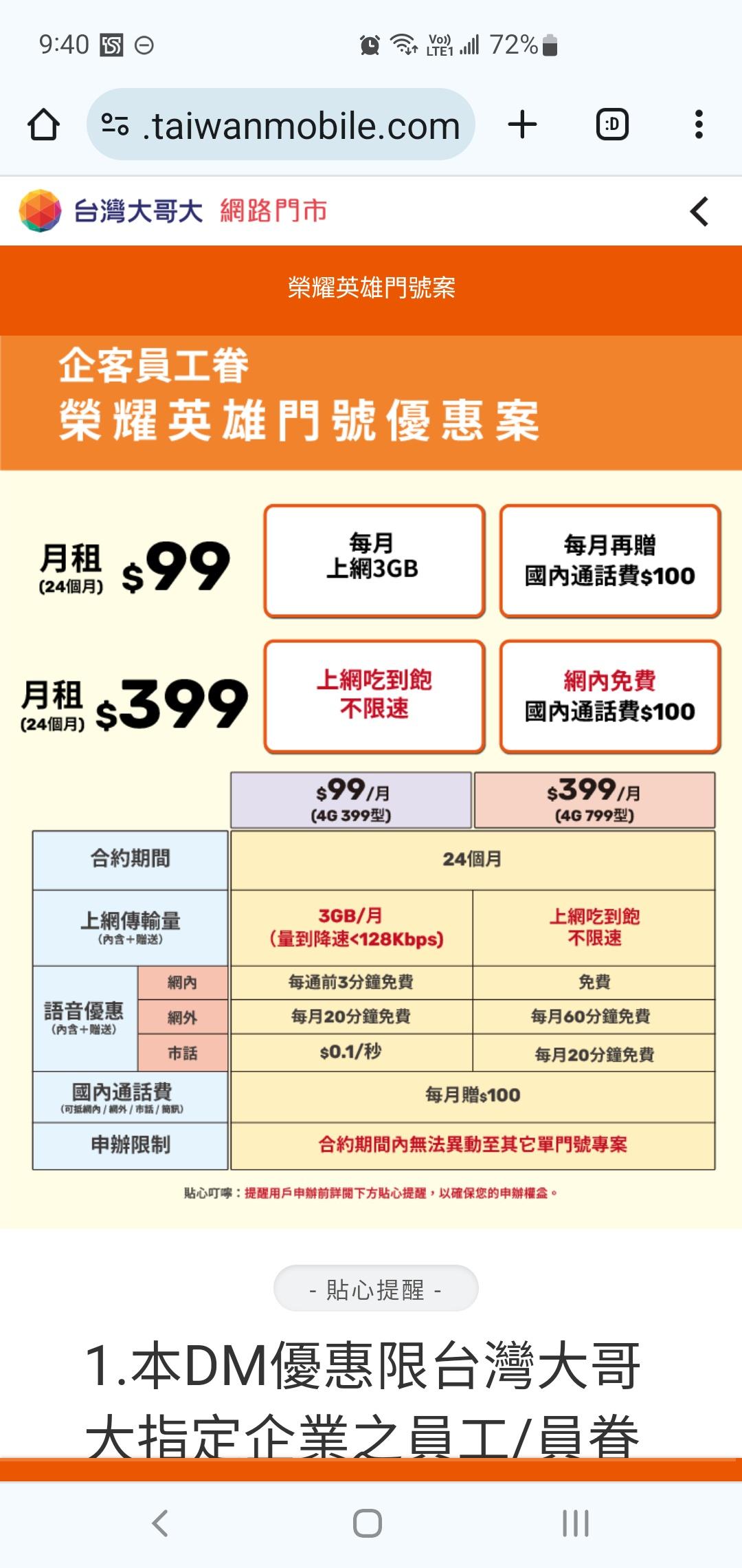 → affectsnow : 台哥大是有399不限速方案,方案名稱是榮耀英雄,不 04/23 17:16