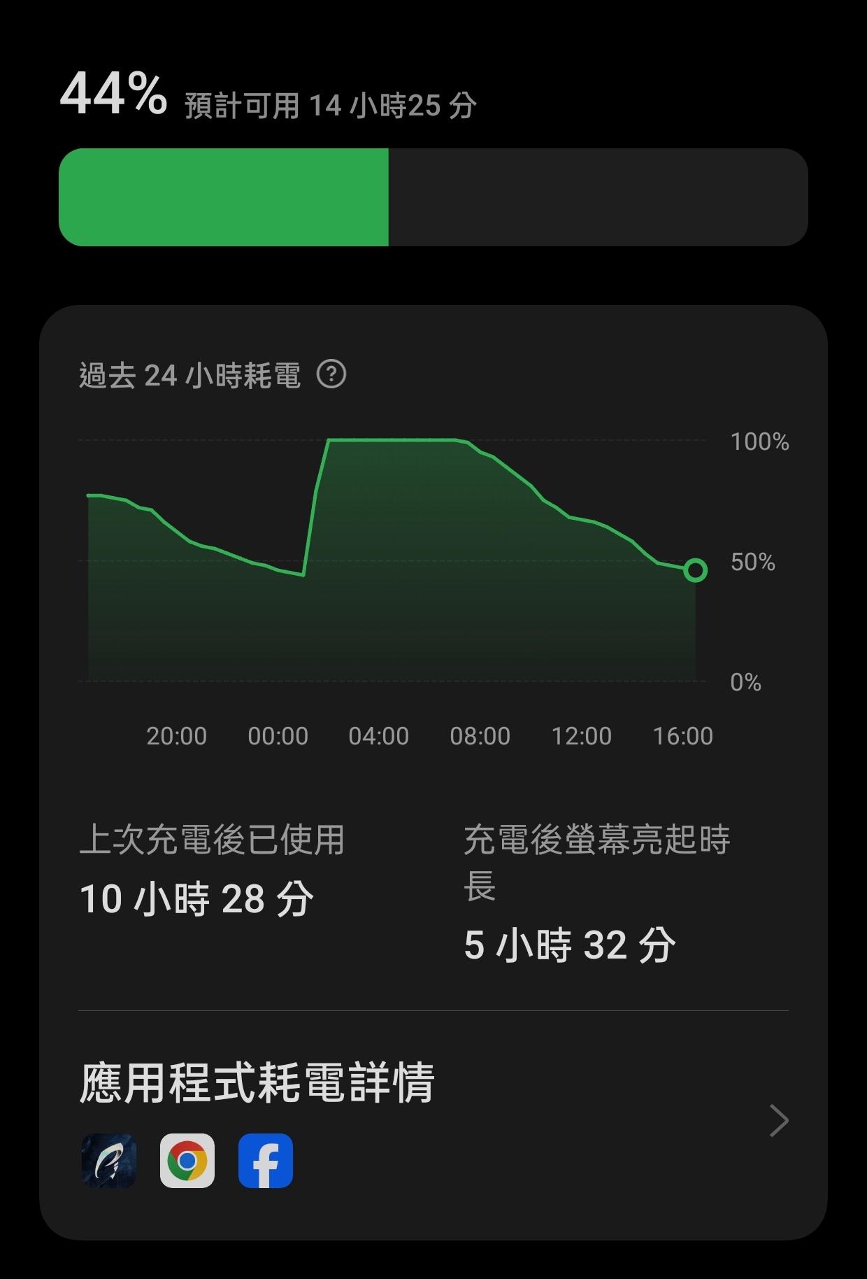 → saimeitetsu : 我的電量使用紀錄大概是這樣,chrome Facebook pit08/02 16:51