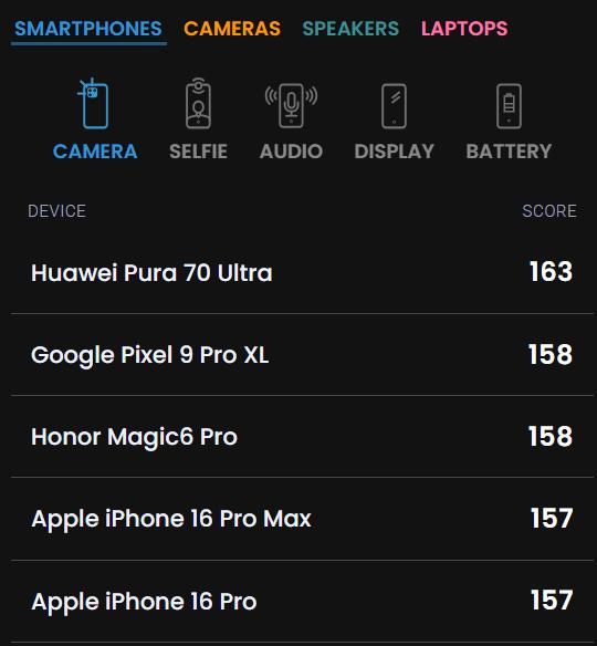 蘋果 iPhone 16 Pro Max DXOMARK 前鏡頭測試排名第 1,總分 151